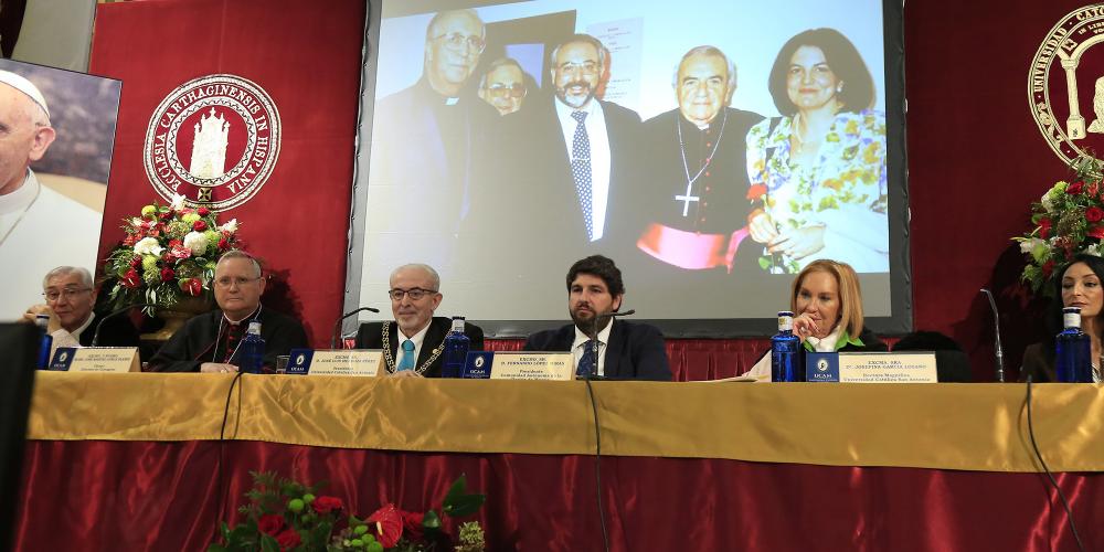 José Luis Mendoza, presidente de la UCAM, ha recordado los principios de la institución a la que representa, “25 años de actividad académica y de historia del Amor de Dios. Una universidad católica y evangelizadora, profundamente existencial, impulsada por la fuerza del Amor de Dios manifestado en Cristo Jesús; con espíritu de entrega y de servicio, y con capacidad para amar y perdonar. Formamos a grandes profesionales pero también nos preocupamos por su vertiente moral”. Asimismo, ha recordado el encuentro que mantuvo recientemente con el Papa Francisco, en el que el Santo Padre mostró su apoyo al Decreto de Apostolado Universitario.