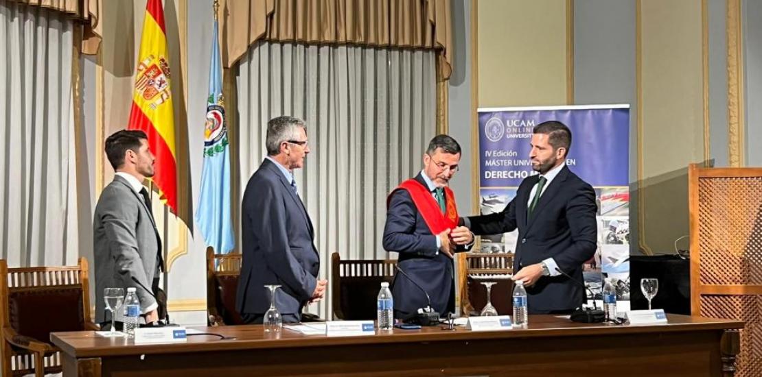 La Universidad Católica de Murcia ha celebrado en el Centro Cultural de los Ejércitos (Madrid) el acto de imposición de becas y entrega de diplomas a las nuevas promociones de estudiantes de su Máster Universitario en Derecho Militar. Pablo Blesa, vicerrector de Relaciones Internacionales de la UCAM presidió el acto, acompañado por el Capitán Auditor Juan Carlos de la Cerra, director del Máster, y Andrés Muñoz, asesor jurídico del Cuartel General Supremo de las Potencias Aliadas de la OTAN en Europa, quien ejerció como padrino.