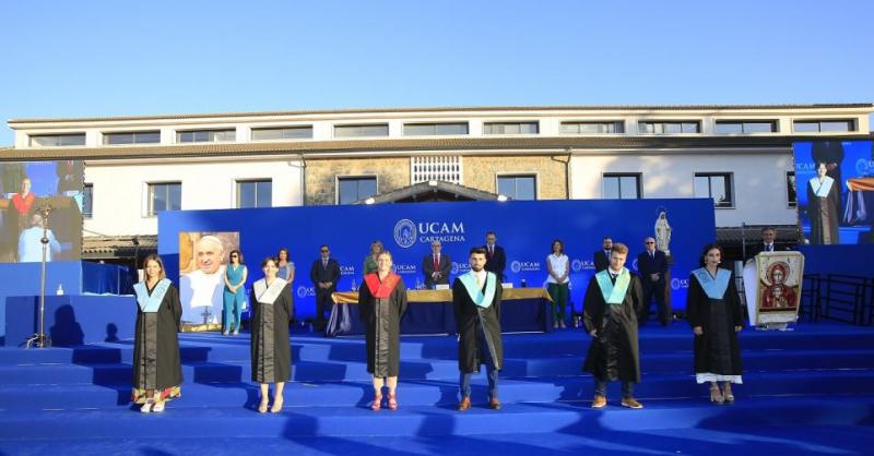 La graduación ha estado presidida por José Luis Mendoza, presidente de la Universidad Católica, y ha tenido como madrina a Noelia Arroyo, alcaldesa de Cartagena y alumna de la primera promoción de la UCAM. El acto se ha desarrollado en el patio de armas del Campus, al que han asistido los estudiantes acompañados por familiares, siguiendo los protocolos de seguridad y la normativa COVID vigente.