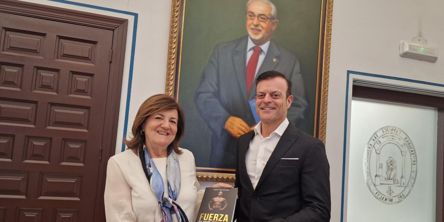 El Campus de Los Jerónimos ha acogido la visita de Aldo Martínez, alumni y profesor de la institución, especialista en alto rendimiento deportivo y preparador físico de Ilia Topuria, doble campeón mundial de la UFC. El conocido divulgador, también popular en redes sociales como ‘Doctor Aldo’, ha hecho entrega de un ejemplar firmado de su obra a María Dolores García, presidenta de la UCAM.
