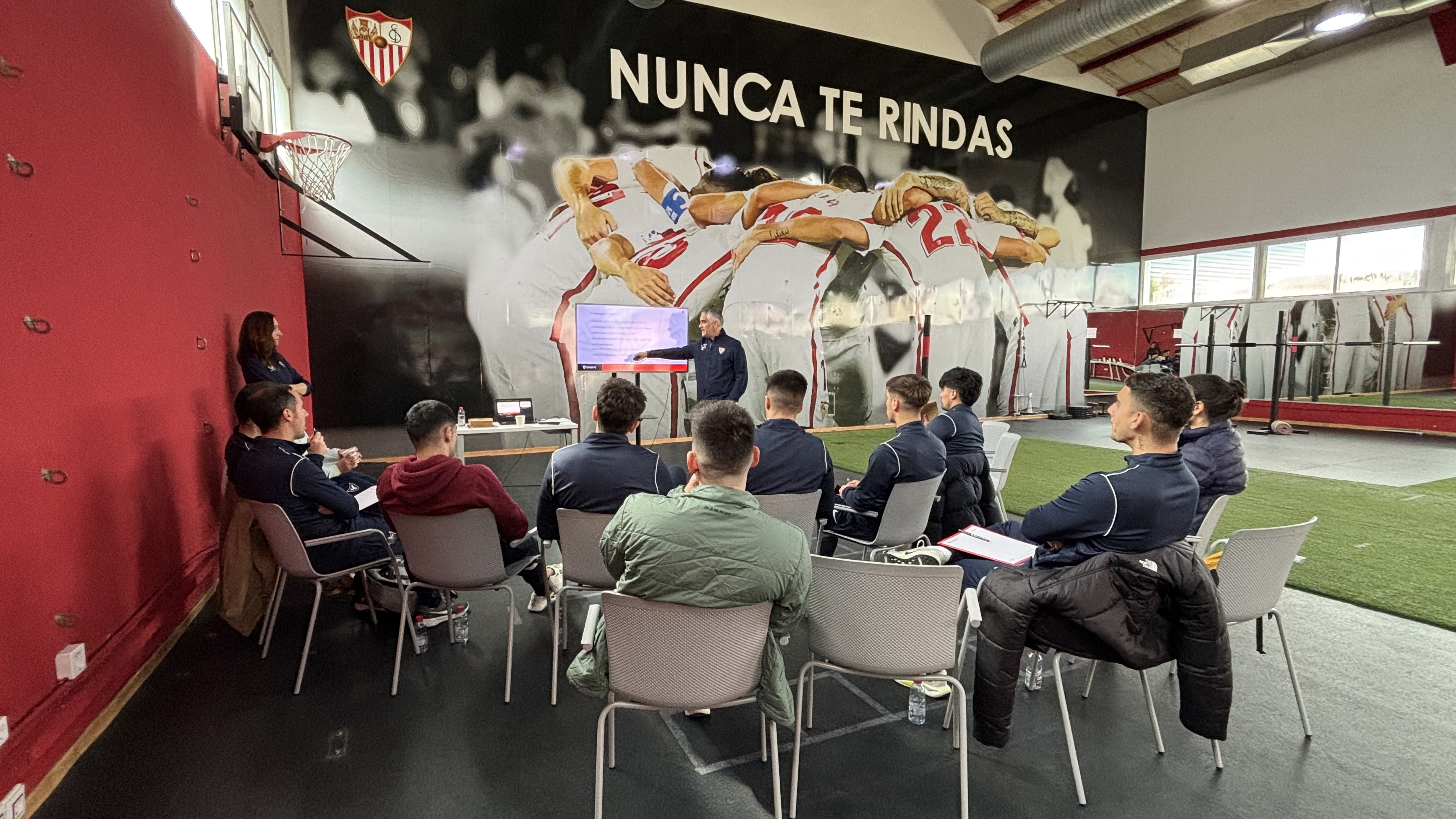 El jueves 27 de febrero, la actividad formativa continuó con una conferencia de Carlos Otero, responsable del Departamento de Optimización del Rendimiento, quien explicó las estrategias que utiliza el Sevilla FC para mejorar el desempeño físico de sus jugadores.