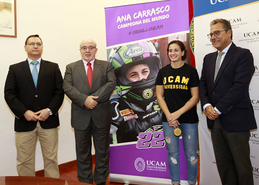 “Ana Carrasco es un gran regalo para el deporte español. Está abriendo camino en el motociclismo, que es un deporte durísimo que exige una gran preparación física y un excelente grado de concentración sumándole el riesgo que supone alcanzar esas velocidades”. Con estas palabras, José Luis Mendoza, presidente de la UCAM presentaba a la campeona del mundo de Supersport 300 ante los medios de comunicación en el primer encuentro de la ceheginera con la prensa murciana desde que hiciera historia en Francia al ser la primera mujer que gana un mundial en cualquier competición mixta de la Federación Internacional de Motociclismo.