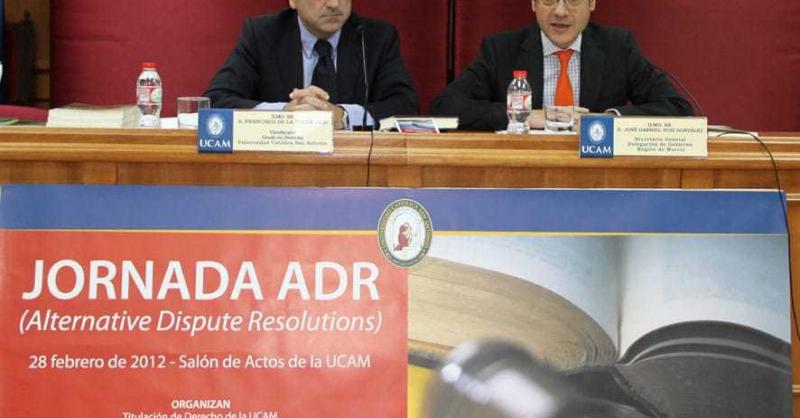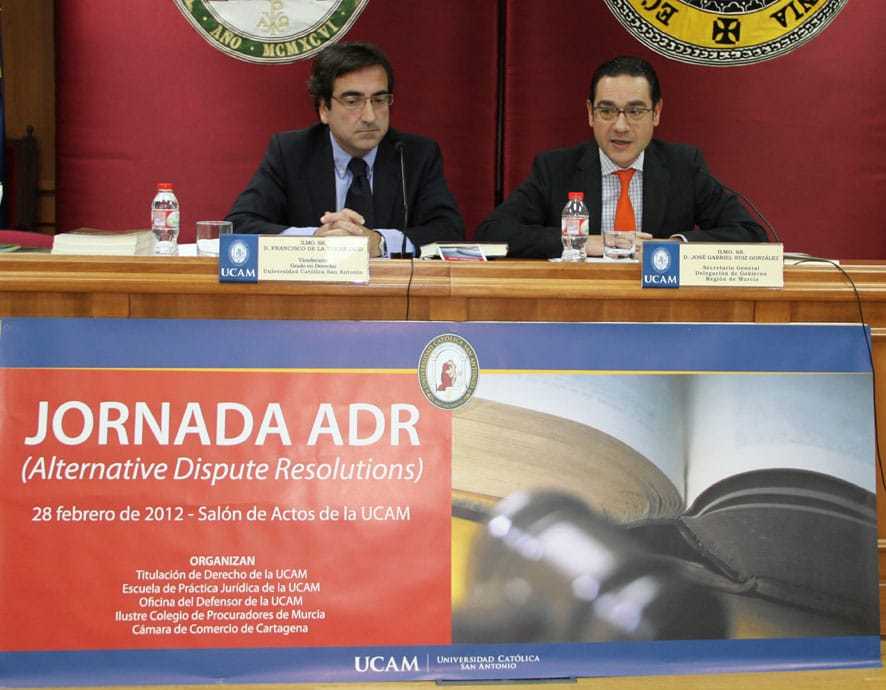 “El arbitraje permite resolver los conflictos surgidos entre dos personas de forma justa, barata, rápida y eficaz. La vía jurisdiccional resulta mucho más lenta“, según declaró el pasado martes 28 de febrero en el Salón de Actos de la Universidad Católica San Antonio (UCAM) el secretario General de la Delegación del Gobierno en Murcia, José Gabriel Ruiz, que pronunció la conferencia `Arbitraje de consumo: una experiencia que es referente para el impulso de las ADR´, en el marco de la Jornada ADR (Alternative Dispute Resolutionns), organizada por el Grado en Derecho, la Escuela de Práctica Jurídica y la Oficina del Mediador Universitario de la UCAM, junto con el Ilustre Colegio de Procuradores de Murcia y la Cámara de Comercio de Cartagena.