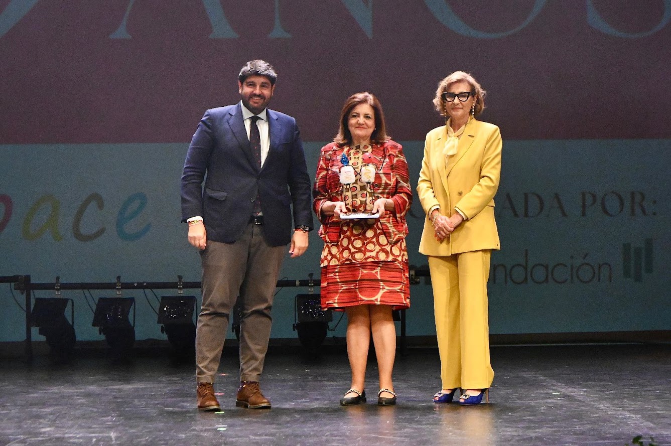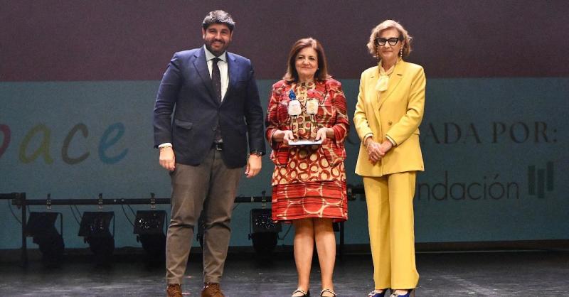Su esposa, María Dolores García, presidenta de la Universidad Católica de Murcia, recogió el galardón de manos de Rosa García, presidenta de Astrapace, y Fernando López Miras, presidente de la CARM, durante la Gala por el 45 aniversario de esta asociación, celebrada en el Teatro Romea de Murcia.