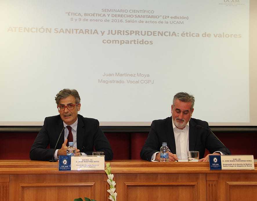 La defensa de la dignidad de la persona o la situación del marco jurídico en relación a la defensa de la vida son algunos de los temas más destacados que se han tratado a lo largo del seminario científico ‘Ética, Bioética y Derecho Sanitario’ organizado por la UCAM. La jornada, que comenzó el pasado viernes 8 de enero, se clausuró la mañana del sábado con la intervención del vocal del Consejo General del Poder Judicial y ex presidente del Tribunal Superior de Justicia de Murcia (TSJM), Juan Martínez Moya.