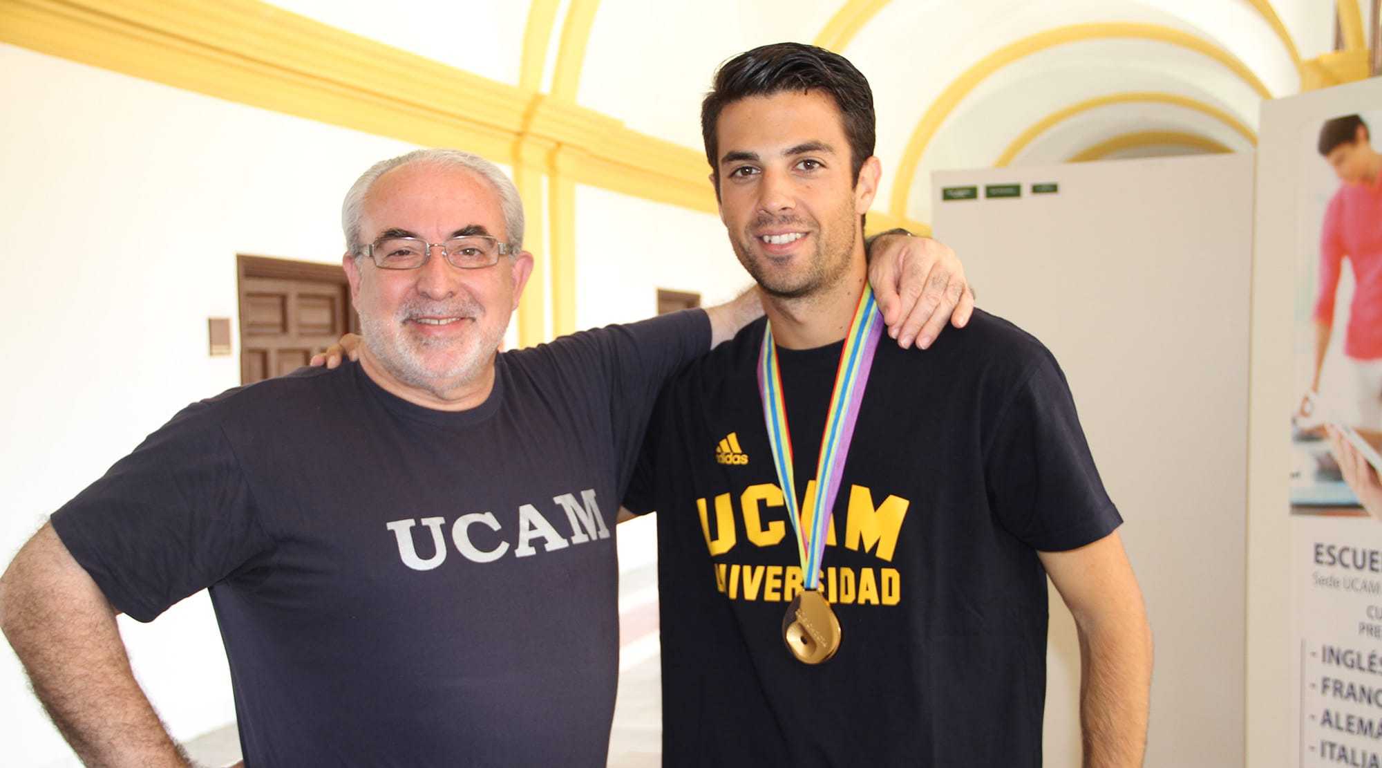 Miguel Ángel López, campeón de Europa de 20 kilómetros marcha, ha visitado la Universidad Católica de Murcia para hacerse un control médico con el doctor Francisco Esparza, director del Máster en Traumatología del Deporte de la UCAM. Aprovechando la visita a su universidad, el atleta del Llano de Brujas no ha desaprovechado la oportunidad de visitar al presidente de la institución universitaria y enseñarle la medalla de oro lograda la semana pasada.