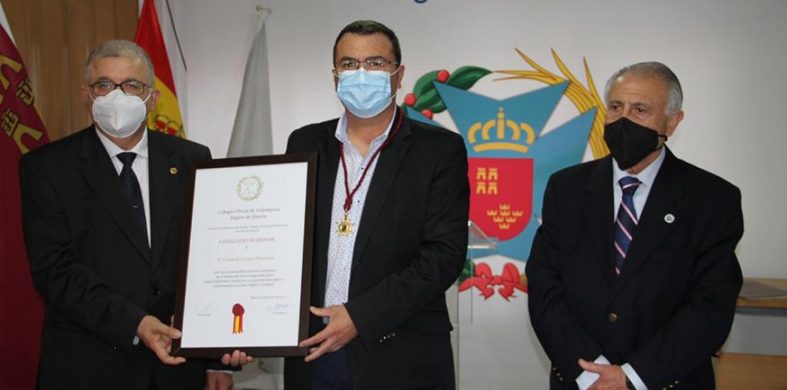 El Ilustre Colegio Oficial de Enfermería de la Región de Murcia ha concedido por unanimidad el título de ‘Colegiado de Honor de 2021’ al enfermero Carmelo Gómez “por su colaboración permanente con la institución colegial, su actividad en defensa de la enfermería geriátrica y por su presencia en la pandemia denunciando la situación de las residencias”.