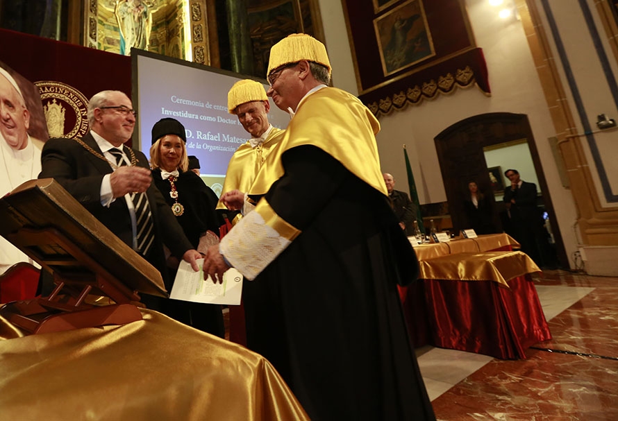 Solidaridad y altruismo. Sobre estos dos principios se basa el sistema de trasplantes de la Organización Nacional de Trasplantes (ONT), institución que ha sido galardonada con diversos premios a lo largo de su historia, y a la que países de todo el mundo acuden en busca de consejo o colaboración con un solo objetivo: mejorar la organización de la donación y el trasplantes de órganos. Estas son algunas de las ideas que expuso Rafael Matesanz, fundador de la ONT en la ceremonia de investidura como Doctor Honoris Causa por la Universidad Católica de Murcia, celebrada el miércoles 14 de febrero en el Templo del Monasterio de Los Jerónimos; acto al que asistieron numeras personalidades del ámbito de la salud, de prestigio nacional e internacional, como el equipo de trasplantes del Hospital Virgen de La Arrixaca.El acto estuvo presidido por José Luis Mendoza, presidente de la UCAM, acompañado por Josefina García Lozano, rectora de la Universidad; Antonio Montoro, rector honorario, y Manuel Ureña, arzobispo emérito de Zaragoza, quien presidió la eucaristía con imposición de la Ceniza que se celebró antes del acto académico. Cabe destacar que se trató de una ceremonia sin precedentes, a la que asistieron numerosas personas que llenaron el Templo.