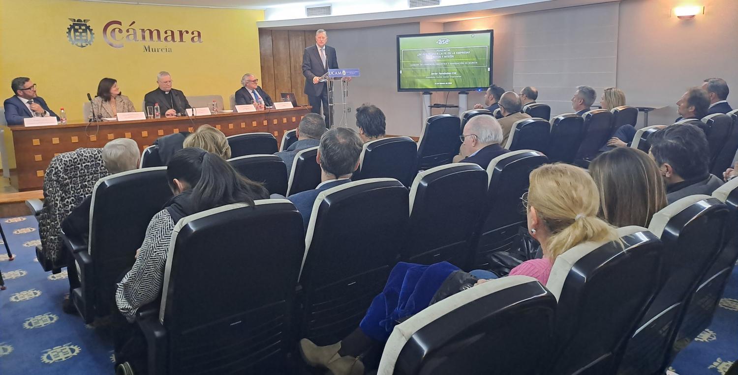 “Es fundamental que las empresas apuesten por la gestión con valores centrada en las personas, lo que supone una garantía de éxito para las instituciones”. Esta es una de las ideas que Javier Fernández-Cid, presidente nacional de ASE, compartió con los asistentes a la conferencia 'La gestión empresarial con valores', que impartió en el marco del acto ‘¿Se puede vivir la fe en la empresa? Retos y misión', organizado por Acción Social Empresarial, la UCAM y la Diócesis de Cartagena. El conferenciante remarcó que “la empresa debe meditar sobre cómo todo lo relativo a la persona influye en los procesos industriales, la gestión, el marketing o la administración”.