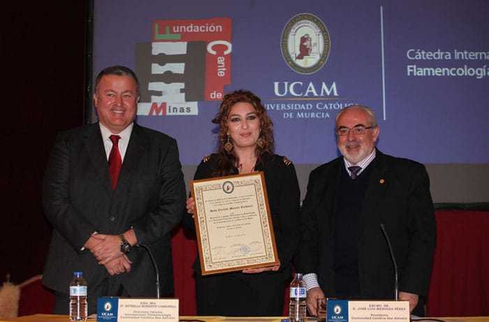Estrella Morente ha querido mostrar su agradecimiento a la UCAM por este nombramiento, arrancándose a cantar unos versos de San Juan de la Cruz, mientras recorría el Templo de Los Jerónimos, ante cerca de mil estudiantes y profesores que abarrotaban la sede de la Universidad. La cantaora granadina ha recibido el nombramiento como directora de la Cátedra Internacional de Flamencología UCAM-Fundación Cante de las Minas, y no ha dudado en afirmar que se trata del “día más importante de mi carrera”. Hay que resaltar que durante el acto el presidente de la UCAM, José Luis Mendoza; y el alcalde de La Unión y presidente de la Comisión Ejecutiva de la Fundación Cante de las Minas, Francisco Martín Bernabé, han dado a conocer futuros proyectos de investigación que desarrollará la Cátedra y que están vinculados a la figura de Enrique Morente.