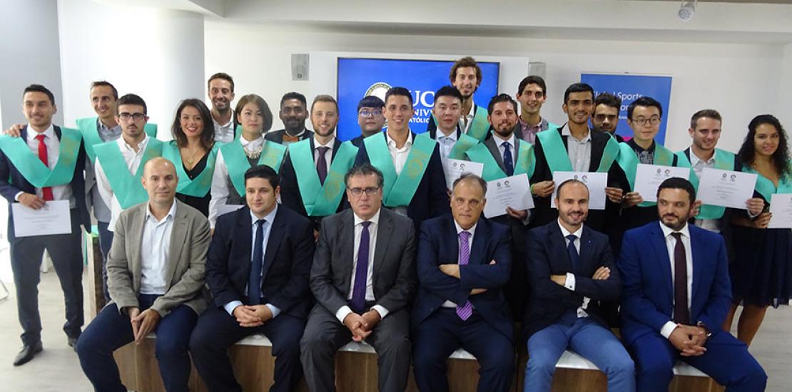 España, China, India, Líbano, Italia, Austria, Colombia y Argentina son los países de origen de los alumnos que han participado en una graduación que ha estado presidida por Gonzalo Wandosell, decano de la Facultad de Ciencias Jurídicas y de la Empresa de la UCAM. Javier Tebas, presidente de LaLiga, ha sido el padrino de esta promoción.