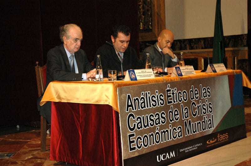 “La crisis nace de la ambición y falta de ética de bancos e instituciones financieras y su solución pasa por la reforma profunda de ambas realidades”, afirmó recientemente en la UCAM el Catedrático de Economía Aplicada de la UNED, Director de la Cátedra BBVA y ex director de CUNEF, Jaime Requeijo, que pronunció la conferencia “La crisis económica mundial: reflexiones desde la Ética”. La ponencia se enmarcó en el programa divulgativo de la Cátedra de Ética, Política y Humanidades UCAM-FAES. Jaime Requeijo, situó los orígenes de la grave situación económica que atravesamos en el inicio de la década de los noventa, momento en el cual asistimos al inicio de la plena libertad de movimiento de capitales en el mundo desarrollado y parte del emergente, que ha disparado una gran revolución en los mercados. “En la actualidad, cualquiera puede mover el dinero a voluntad con total libertad. El mercado financiero mundial se ha unificado, generando una gran competitividad. La aplicación de la informática constituye el segundo motor del cambio en las finanzas, al permitir la realización de transferencias y operaciones a gran velocidad”. Requeijo añadió que “el tercer vector del cambio, pivota en torno a la existencia de un sistema financiero en la sombra, integrado por los bancos de inversiones y los fondos de alto riesgo, menos regulados que los sistemas financieros tradicionales”.El catedrático destacó como desencadenantes de la crisis financiera, los pinchazos de las burbujas de riesgo, de los comportamientos adecuados y de la confianza. El economista afirmó que el porvenir de la economía no es nada claro, ya que a nivel mundial existe una gran moratoria de deuda, que hay que superar. “La ambición y la falta de ética, nos han llevado a esta situación y la solución pasa por reformar la banca y el sistema financiero y por regular de forma más sensata los procesos de intermediación en las finanzas”, concluyó.
