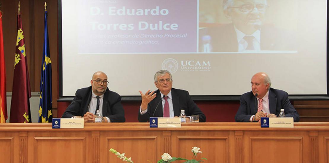 El ex fiscal General del Estado y profesor de Derecho Penal, Eduardo Torres Dulce, ha impartido una conferencia a los alumnos del Grado en Derecho y del Máster en Abogacía de la UCAM, en el marco de la jornada sobre cine jurídico que ha tenido lugar en el Campus de Los Jerónimos.