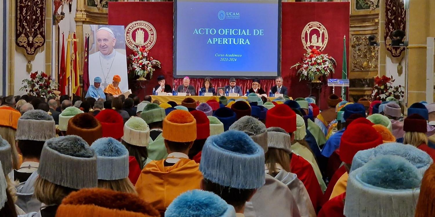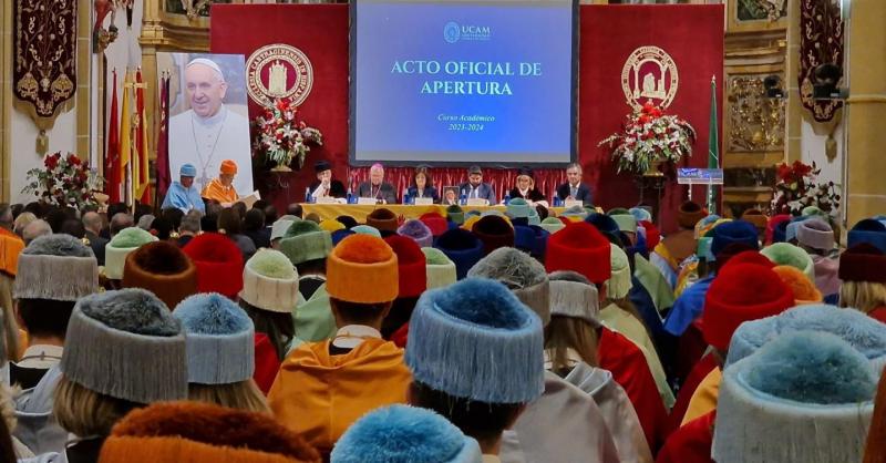 María Dolores García, presidenta de la UCAM, ha tenido muy presente al fundador de la Universidad Católica de Murcia en su discurso del Solemne Acto de Apertura del Curso Académico 2023-2024, en el que se han superado los 23.000 alumnos. La Eucaristía ha estado oficiada por el obispo de Cartagena, José Manuel Lorca, y la Lección Inaugural la ha impartido el experto en Economía Civil, Stefano Zamagni