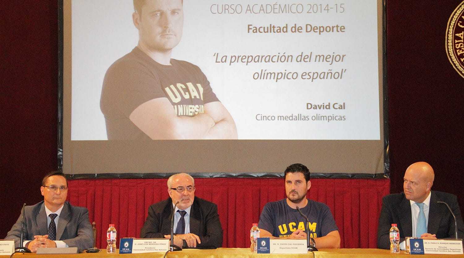 Tras conocer todas las novedades del nuevo curso de mano del decano de la Facultad de Deporte, Antonio Sánchez Pato, los alumnos y profesores han participado en una charla con David Cal sobre la preparación de un deportista olímpico de alto nivel. A la mesa también se incorporaron José Luis Mendoza, presidente de la UCAM; y Pablo Rosique, director de Servicio de Actividades Deportivas. David Cal ha destacado la importancia que tiene este año en su gran objetivo de lograr la sexta medalla olímpica de su palmarés: “Es el tercer año del ciclo olímpico y es muy importante porque en el Campeonato del Mundo de 2015 me juego la clasificación para Río 2016. Desde el Mundial sólo se clasifican los seis primeros y aunque después hay repescas continentales, no me interesa entrar en esa guerra. Es mejor lograr el objetivo cuanto antes”.