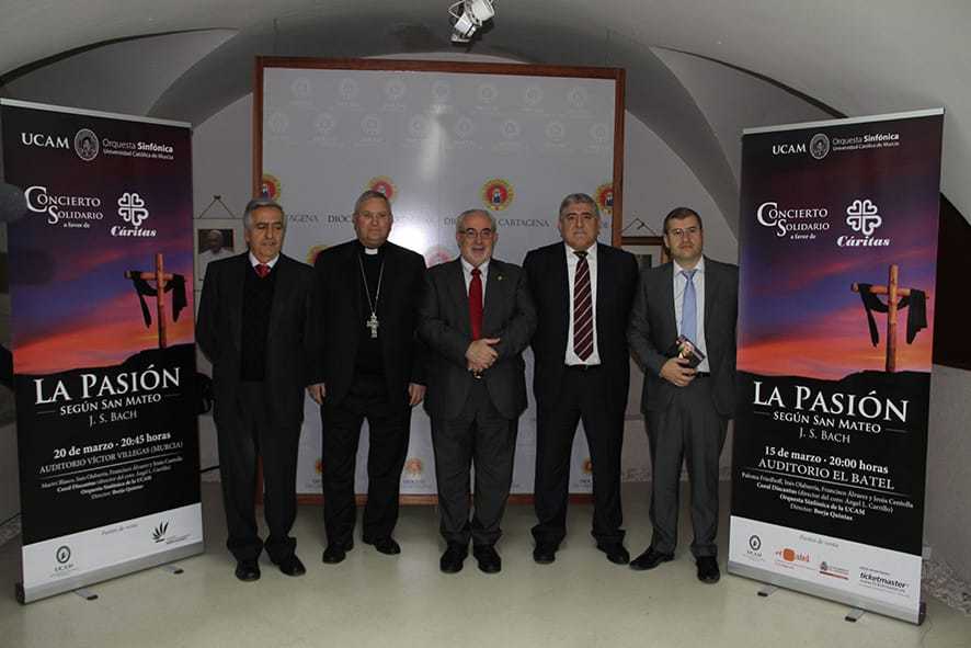 La Universidad Católica de Murcia ha presentado esta mañana, en el Palacio Episcopal de Murcia, la agenda de conciertos programados por su Orquesta Sinfónica para el próximo mes de marzo. Entre ellos hay que resaltar La Pasión según San Mateo, la versión más extensa de Juan Sebastián Bach, que interpretará junto con la Coral Discantus, y bajo la dirección de Borja Quintas, y cuya recaudación irá destinada a Cáritas. En la presentación han intervenido el presidente de la UCAM, José Luis Mendoza; el presidente de Cáritas, José Saura; y el obispo de la Diócesis de Cartagena, José Manuel Lorca Planes.