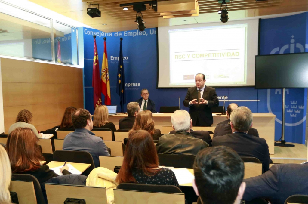 La Cátedra Internacional de RSC de la UCAM ha congregado esta mañana a 40 empresas y profesionales en las jornadas del proyecto de impulso de la RSC en la Región de Murcia. La sesión ha tenido lugar en el salón de actos de la Consejería de Empleo, Universidades, Empresa y Medio Ambiente con la ponencia de Víctor Meseguer y Francisco Martínez Ruiz