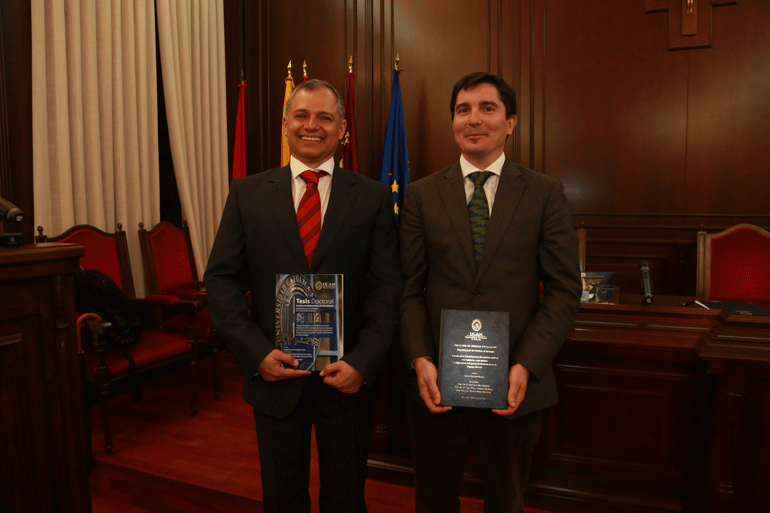 Los nuevos doctores por la UCAM, Jorge Eduardo Delgado y Javier Mareque, han obtenido la nota de sobresaliente cum laude en sus respectivas investigaciones