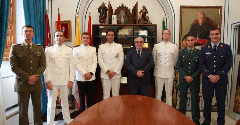 En julio recibieron sus reales despachos de manos del Rey Felipe VI por tener los mejores expedientes de su promoción y ahora se han incorporado al Máster Oficial en Derecho Militar de la UCAM. Los cinco tenientes y un alférez de navío fueron recibidos por el presidente de la institución docente, José Luis Mendoza, a quien agradecieron que les haya becado en este postgrado oficial, único en España: “Es un privilegio poder formarnos en el ámbito del derecho castrense, lo que nos permitirá servir mejor a España, que es nuestra verdadera vocación y principal interés”, dijo en nombre de todos el más veterano, el teniente del Ejército de Tierra, Rodrigo Pardo de Santayana.