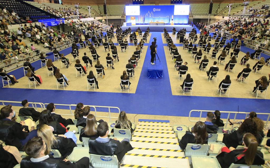 Alegría y satisfacción son emociones que se están viviendo durante los actos de imposición de becas y entrega de diplomas a los estudiantes, de todas las titulaciones, tanto de grado como de postgrado, de la promoción 2021 de la Universidad Católica San Antonio de Murcia. La institución, que suele celebrar sus graduaciones en el Templo del Monasterio de Los Jerónimos (sede del Campus), dadas las actuales circunstancias, y haciendo un importante esfuerzo, las ha trasladado al Palacio de los Deportes de Murcia, para seguir posibilitando que los alumnos estén acompañados de familiares, de forma segura y cumpliendo en todo momento con la normativa COVID vigente.