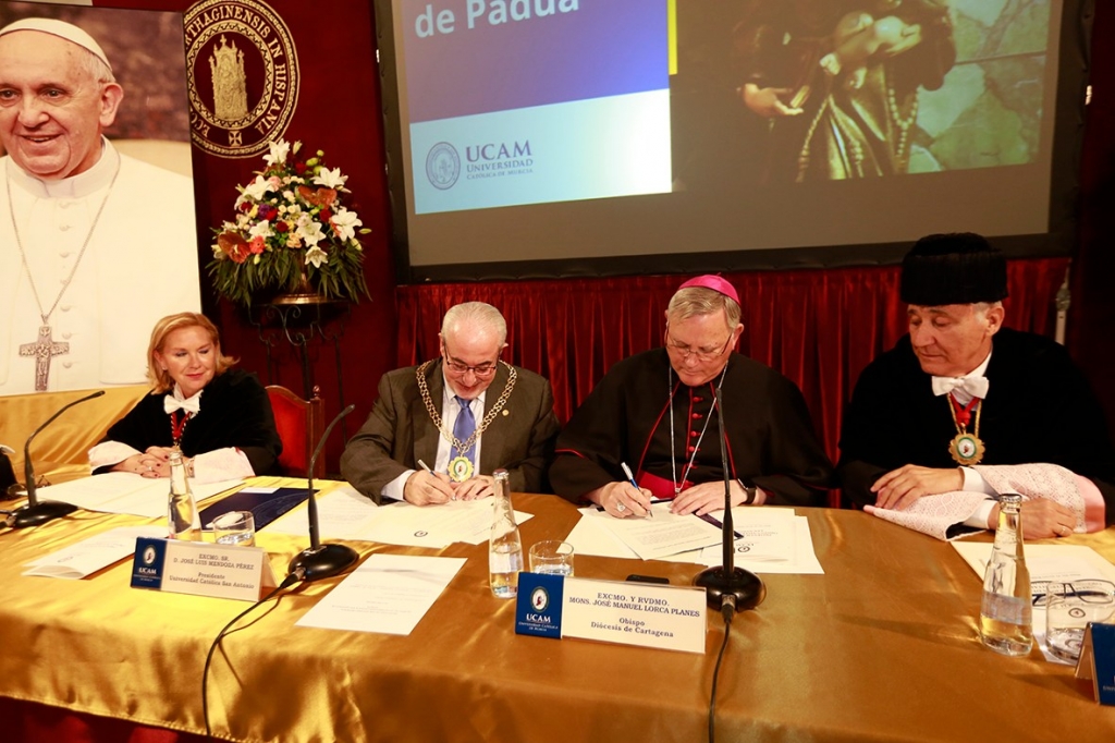 Cientos de doctores han participado esta mañana en el acto con motivo de la festividad de San Antonio, patrón de la UCAM, que se ha celebrado en el Monasterio de Los Jerónimos. Una de las grandes novedades de este año ha sido la presentación de la Orden Universitaria de San Antonio. El catedrático de Historia del Derecho y Fuentes Canónicas, Javier Belda, ha dado a conocer esta nueva orden, única en el mundo, formada por laicos, y que tendrá como objetivo fundamental hacer presente a nivel mundial la Iglesia a través de la evangelización y el compromiso social.