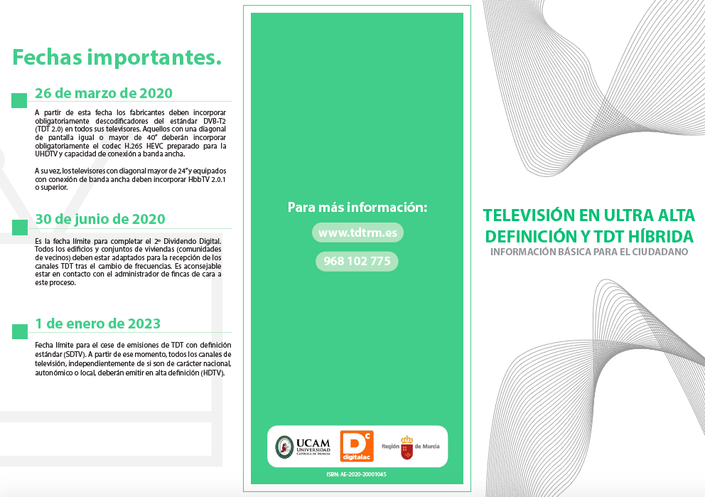 Este documento que actualiza a la anterior Guía de la Televisión en Alta Definición (HDTV), puede consultarse en la web https://www.tdtrm.es/normativa.jsp#uhdtv , incluye información relativa al mercado de receptores y contenidos existentes en UHD, así como a la tecnología empleada por los servicios interactivos que se ofrecen a través de la “TDT Híbrida”. El estudio ha sido dirigido por los doctores Rafael Melendreras Ruiz y Juan Francisco Hernández Pérez, y en él han colaborado alumnos del Grado en Ingeniería en Sistemas de Telecomunicación de la UCAM.