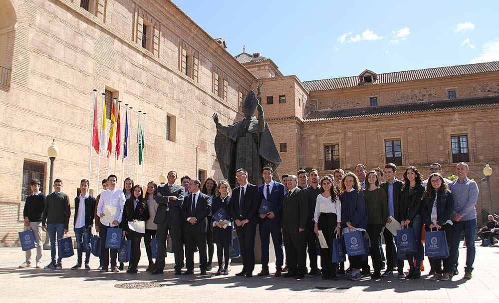 La Universidad Católica, junto con la Fundación Séneca, cofinanciadora del evento, ha celebrado la ceremonia de entrega de los premios en la que se han entregado seis becas de estudio del 100% de la matrícula del primer año, nueve del 50% y diez del 25% de bonificación. Además, se ha obsequiado a los premiados con seis tablets, nueve cámaras deportivas y diez kits de ropa deportiva.