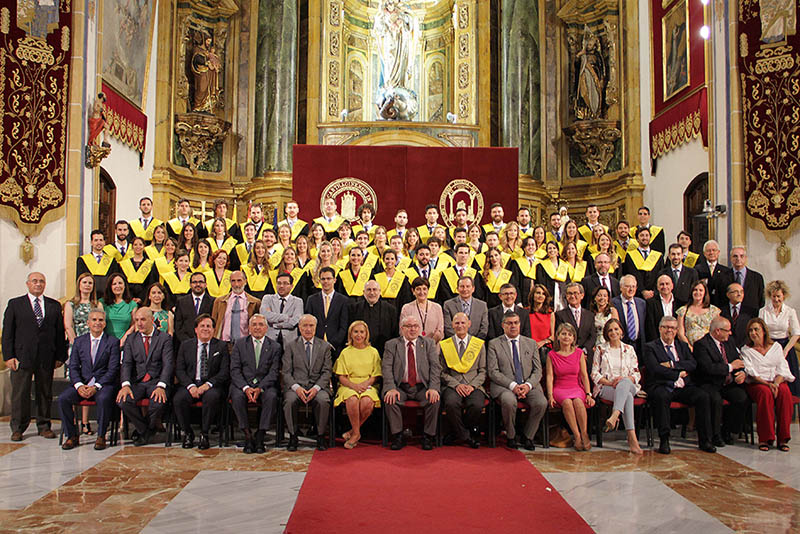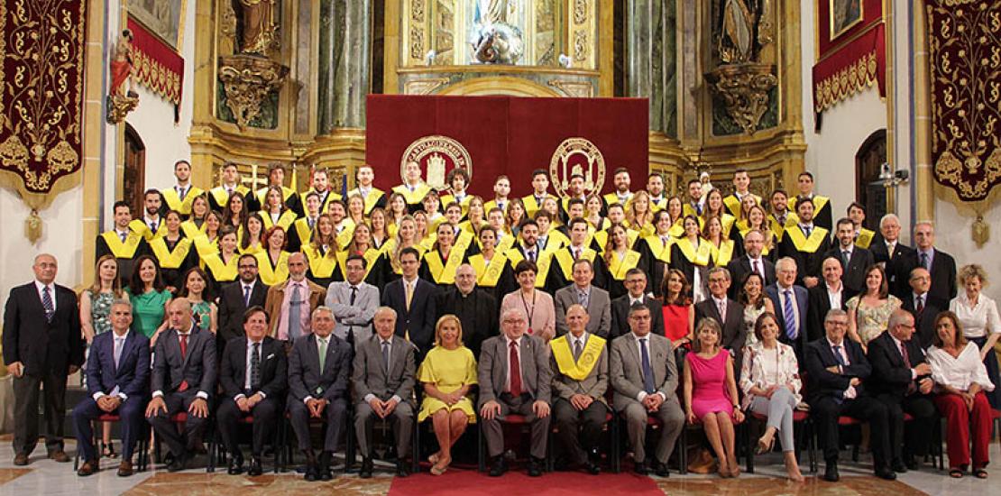 Jornada histórica en el Templo del Monasterio de Los Jerónimos en el acto de Graduación de la Primera Promoción del Grado en Medicina de la UCAM. Seis cursos de duro trabajo académico que terminan con la imposición de las becas amarillas oro que relucieron por primera vez en la Universidad Católica. La mesa presidencial estuvo formada José Luis Mendoza, presidente de la UCAM; Josefina García, rectora de la Universidad; Jerónimo Lajara, decano de la Facultad de Ciencias de la Salud; Pedro Guillén, decano honorario del Grado en Medicina; y Juan Carlos Izpisua, catedrático de Biología del Desarrollo.