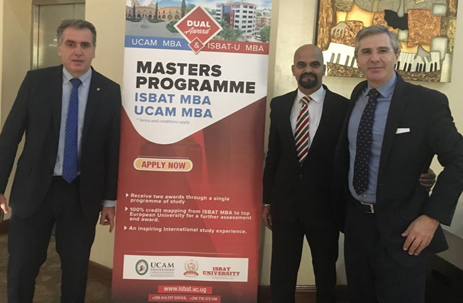 La Universidad Católica de Murcia, fruto de su acuerdo de colaboración con la universidad ISBAT de Kampala, ha graduado recientemente en Uganda a un grupo de estudiantes de MBA. La UCAM certifica este Máster que permite al alumno de la ISBAT obtener una doble titulación: por un lado el título oficial de la institución africana y por otro el título propio de la Católica de Murcia. Se trata de la primera edición de este programa conjunto.En el acto participaron, por parte de la UCAM, Gonzalo Wandosell, decano de la Facultad de Ciencias Jurídicas y de la Empresa, y director del título, y Pablo Blesa, vicerrector de Relaciones Internacionales y Comunicación; y por parte de la ISBAT, Sudhindra Bhat, Dy, vice-Chancellor.