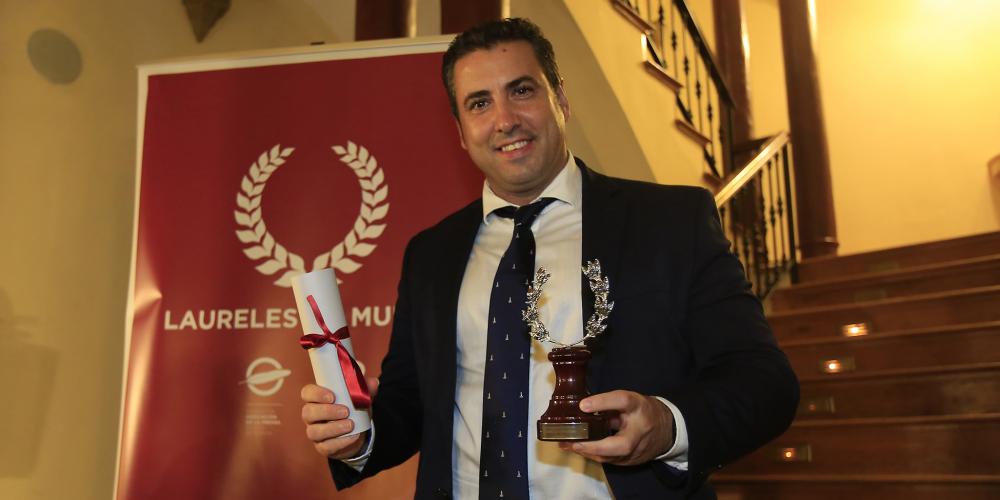José Luis Mendoza García, director de Relaciones Institucionales de la UCAM, recogió el premio de manos de Juan Antonio de Heras, presidente de la Fundación Asociación de la Prensa de la Región de Murcia. El Laurel Extraordinario se concedió a los profesionales de la sanidad que han trabajado y trabajan en primera línea de lucha contra la COVID-19 y a todos los trabajadores de los sectores que, en los momentos más difíciles de la pandemia, han contribuido con su esfuerzo y sacrificio a que la sociedad se sintiera segura, abastecida, cuidada e informada.