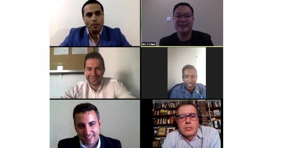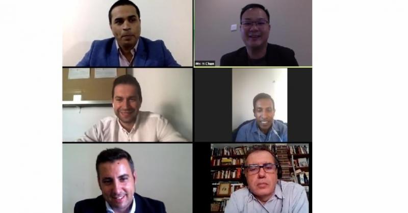 El director de Relaciones Institucionales de la UCAM, José Luis Mendoza García, el decano de la Facultad de Ciencias Jurídicas y de la Empresa, y el director del Área de Partners de la Universidad, Miguel Martí, han rubricado el acuerdo on line con los responsables del centro esrilanqués.