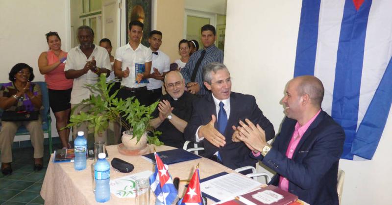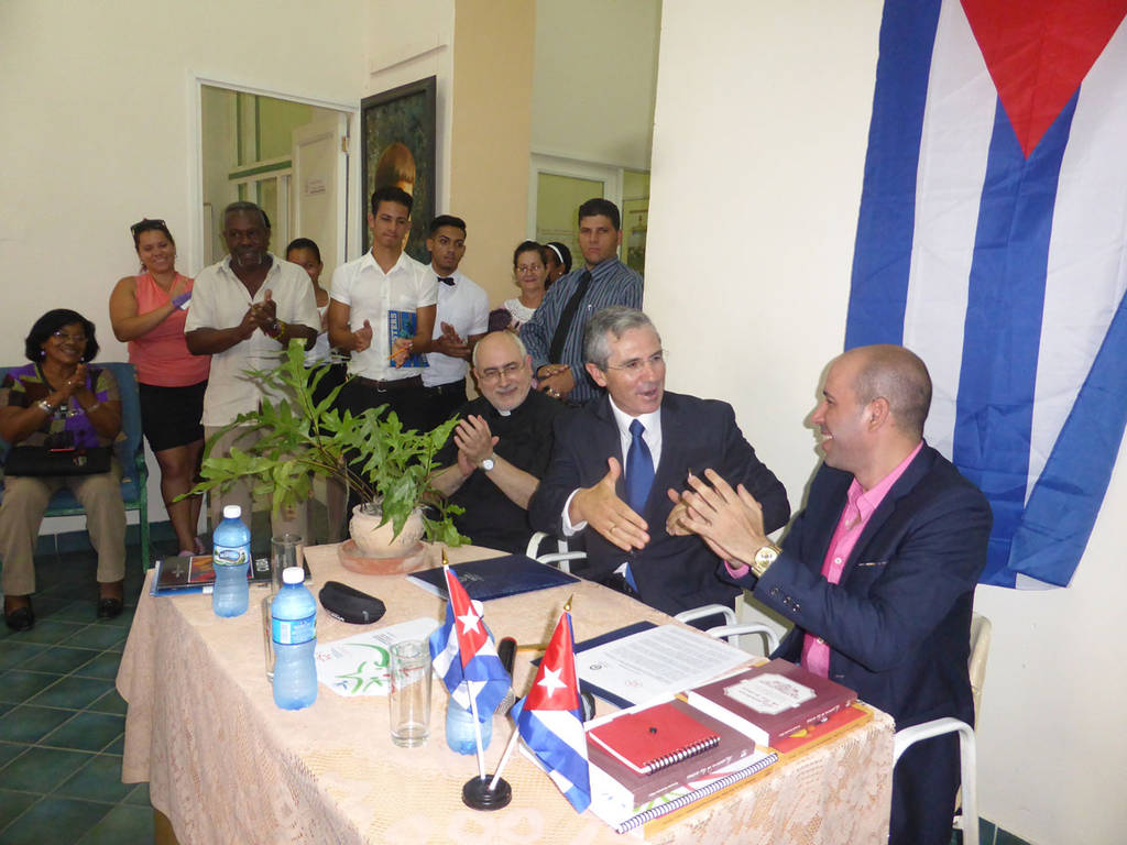 Por otra parte, los vicerrectores de la UCAM firmaron un acuerdo con Ángel Aguilera, presidente del Consejo Popular Catedral La Habana Vieja y responsable del proyecto de desarrollo local comunitario “La Moneda Cubana: Programa de Entrenamiento para Jóvenes”, reconocido en 2016 con el “Premio a la Excelencia”. Este acuerdo permitirá a más de mil alumnos inscribirse en la UCAM para realizar distintos ciclos formativos bajo la asesoría e implicación de esta Universidad, recibiendo al finalizar el certificado académico que facilite su inserción laboral. Se trata de jóvenes desvinculados del trabajo y los estudios, que se formarán en los ámbitos de cocina, gastronomía, coctelería, idiomas o protocolo.