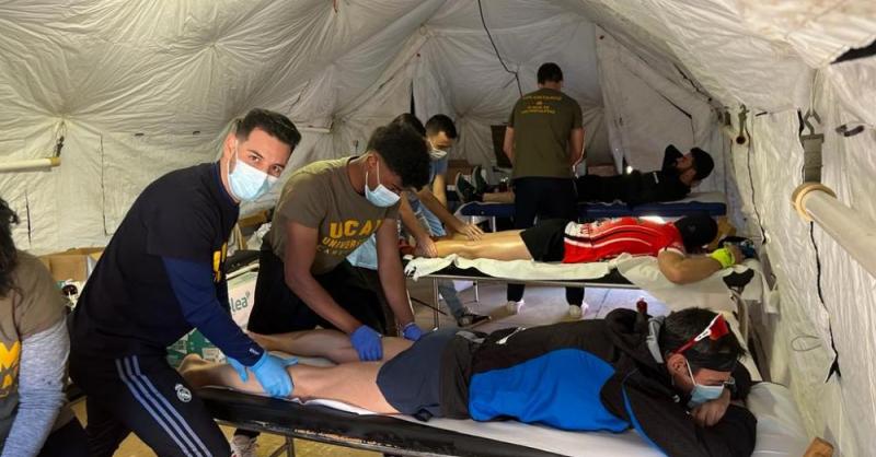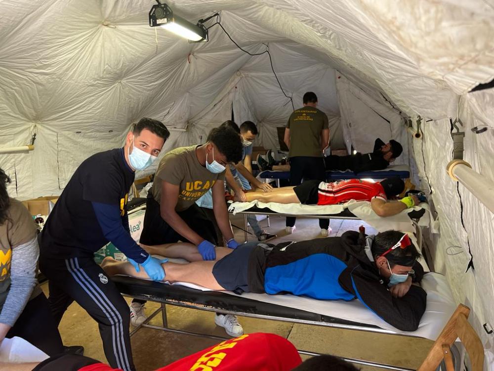 Sesenta alumnos de los grados en Fisioterapia, Podología y Enfermería de la Universidad Católica San Antonio en Cartagena están atendiendo a los corredores, que así lo requieran, en la XI Ruta de las Fortalezas que se está disputando hoy.