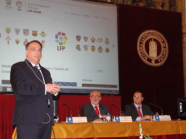 Por último, Javier Tebas ha participado junto a José Luis Mendoza y Antonio Sánchez Pato, decano de la Facultad de Ciencias de la Actividad Física y del Deporte (CAFD) en la graduación del Máster en Dirección y Gestión de Entidades Deportivas. Curiosamente, este máster es el primero que se integra desde ya en el ‘Sports Management Institute LFP-UCAM’ que tendrá además una versión internacional en Perú. Es el primer paso de un proyecto que ampliará sus horizontes con nuevos estudios y nuevas sedes en el futuro.