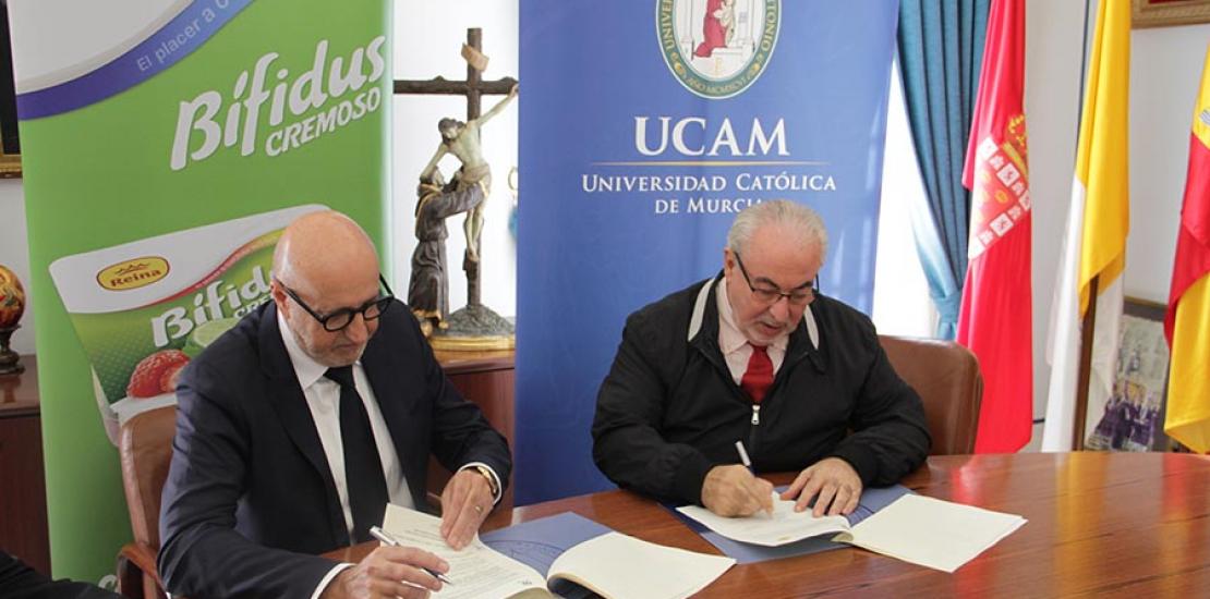 El presidente de la Universidad Católica de Murcia, José Luis Mendoza, y el presidente del Grupo Postres Reina, Alfonso López, han firmado esta mañana un convenio mediante el cual han creado la Cátedra de Investigación de Innovación en Productos Lácteos. “Este acuerdo representa un compromiso con la innovación y la investigación para hacer de hilo conductor entre la vida académica y la laboral”, ha explicado el presidente del Grupo Postres Reina. Además, “la alimentación vive cambios a un ritmo frenético, por lo que es fundamental entender y adelantarse a lo que quiere el consumidor”. Alfonso López también ha alabado la labor de la Católica de Murcia en la formación de los alumnos: “Tenemos muchos proyectos en marcha, pero tenemos la dificultad de encontrar a los profesionales que sean capaces de llevarlos adelante. En la UCAM estamos en el lugar adecuado para encontrarlos y que puedan ayudarnos a cubrir nuestras necesidades”.