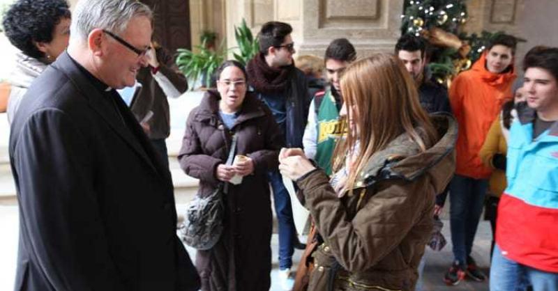 Los alumnos de la UCAM felicitan la Navidad al obispo José Manuel Lorca Planes