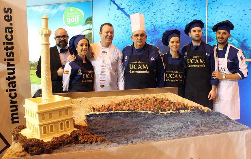 Entre los dos, y acompañados de Pablo Gómez, y los alumnos del Grado en Gastronomía, han creado una reproducción del Mar Menor sobre una bandeja de acero alimenticio, trabajando en una mesa fría de cocina y utilizando alimentos característicos de la Región . Para recrear el agua, González-Conejero ha optado por utilizar miga de pan tintada de azul simulando el Mar Menor. Por su parte, del interior de la estrucutra han salido los frutos, como salazones, pescados y mariscos, tan característicos de la cocina murciana.Por su parte, el toque dulce lo ha dado Tino Helguera con la ayuda de los alumnos, con una escultura del Faro de Cabo de Palos de chocolate blanco de 1 metro de alto, representando de una forma diferente este ícono de la zona costera.Las representaciones gastronómicas han sido acabadas a tiempo para la llegada al stand del presidente de la Comunidad, Pedro Antonio Sánchez, quién ha sido el primero en degustar ‘El Mar Menor Gastronómico’.