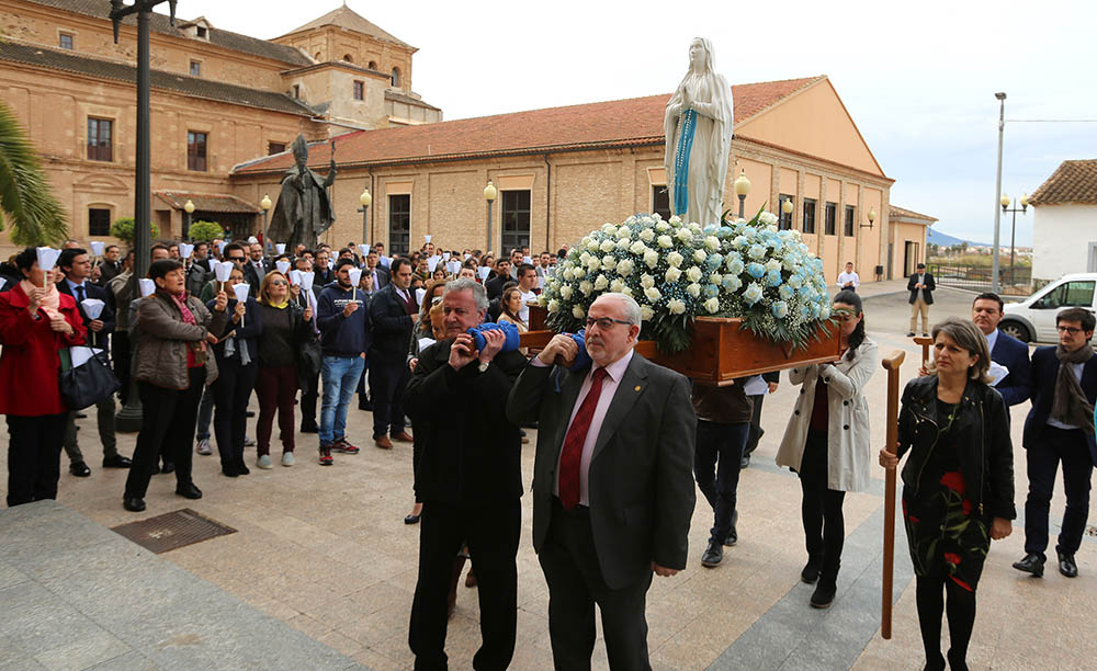 La imagen de la Virgen de Lourdes ha sido recibida esta mañana por toda la comunidad universitaria de la UCAM en su llegada al Campus donde permanecerá hasta este próximo miércoles por la tarde. Se trata de la imagen que permanece durante el año en la sede de la Hospitalidad de Lourdes en Murcia y que se encuentra peregrinando con motivo del Año Jubilar Hospitalario que se celebra en la Diócesis.