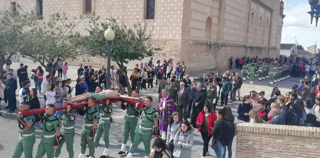 Momentos emotivos los que se han vivido esta mañana en la Universidad Católica de Murcia. A las 11 de la mañana el Cristo de los Estudiantes salía del Templo del Monasterio de Los Jerónimos a hombros del Regimiento de Infantería de Zaragoza nº 5 de paracaidistas, para desfilar en procesión por el Campus de la UCAM. Se trata de la primera vez que se celebra este acto en la Universidad, en el que también ha desfilado la banda militar. Asimismo, han acompañado a la talla José Luis Mendoza, presidente de la UCAM, oficiales del Regimiento y miembros de la comunidad universitaria. Durante la procesión, se ha realizado una oración por los miembros de las fuerzas armadas en misiones internacionales de paz. En el marco de las plegarias por aquellos militares caídos, el presidente de la UCAM, junto al coronel y al capellán del Regimiento, han realizado una ofrenda floral a la Virgen María y se han unido bajo la oración de los paracaidistas.