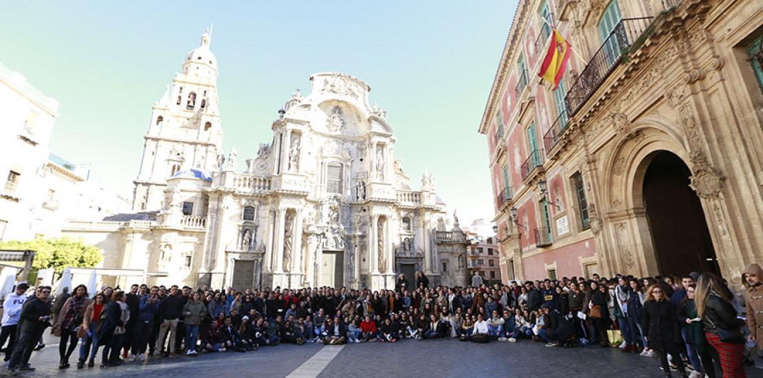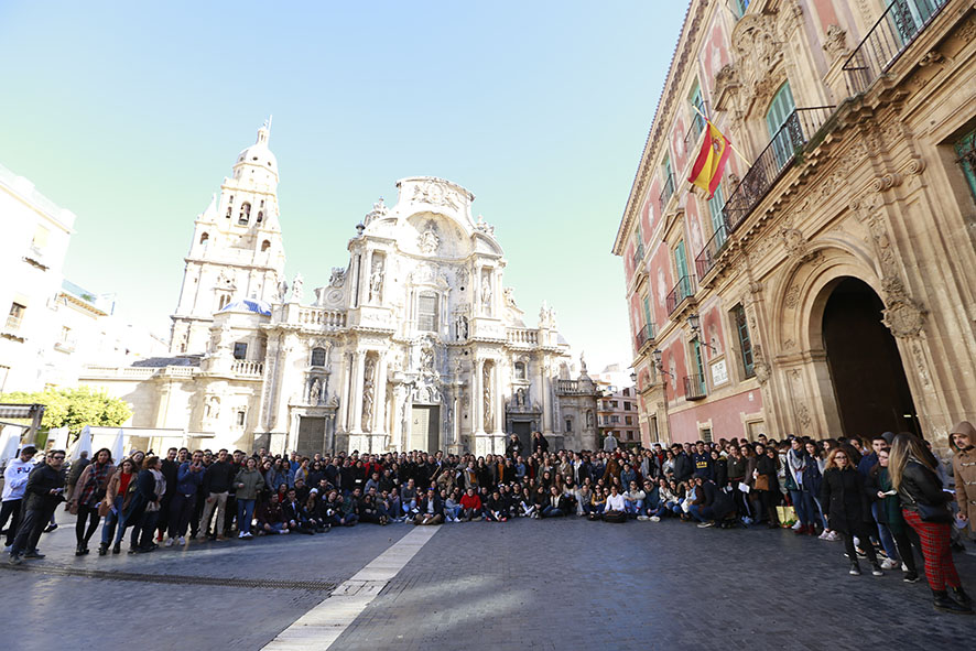 Más de un millar de alumnos participaron en la Misión Joven Navidad 2018 organizada por el Vicerrectorado de Extensión Universitaria de la UCAM.La misión comenzó con un encuentro en la Parroquia San Francisco de Asís (Padres Capuchinos). Desde este punto la comitiva recorrió las diferentes calles y plazas de Murcia para felicitar la Navidad y repartir a los viandantes pegatinas de las Obras Misionales Pontificias. El multitudinario acto finalizó con el canto de villancicos ante el Belén del Palacio Episcopal.