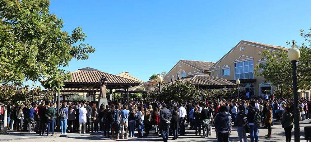 Varios centenares de personas entre alumnos, profesores y personal de administración y servicios de la Universidad Católica de Murcia han detenido hoy al mediodía su actividad para participar en un acto de homenaje a las víctimas de los atentados terroristas de París. En el acto han tomado parte numerosos alumnos internacionales que estudian en la UCAM, entre los que se encuentra un grupo de estudiantes franceses. Luis Emilio Pascual, capellán mayor de la UCAM, ha dirigido unas palabras a los asistentes expresando su repulsa por estos atentados y su deseo de que no se vuelvan a repetir actos de este tipo ni en Europa ni en ningún otro lugar del mundo. A las doce en punto, en la Plaza de las Pérgolas del Campus de Los Jerónimos se ha guardado un minuto de silencio y posteriormente se ha invitado a los que lo desearan a unirse a un Padrenuestro por el alma de las víctimas de los atentados.