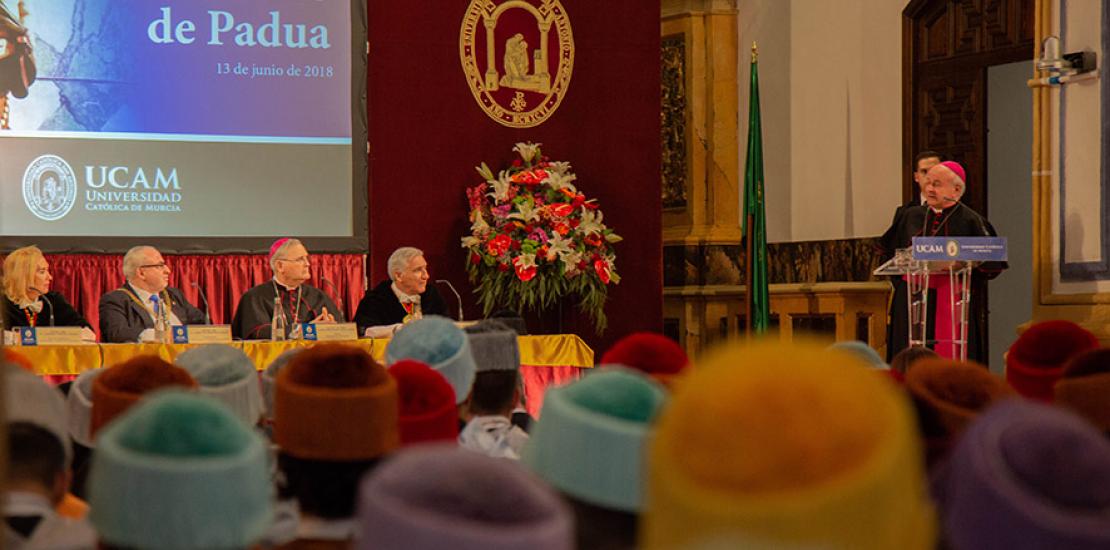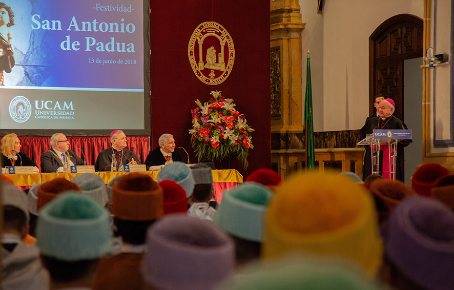 La Universidad Católica de Murcia ha celebrado esta mañana, en el Templo del Monasterio de Los Jerónimos, los actos conmemorativos de la festividad de su patrón, San Antonio de Padua. El presidente de la UCAM, José Luis Mendoza, ha presidido el acto acompañado por la rectora de la Universidad, Josefina García Lozano; el rector honorario de la institución, Antonio Montoro; los arzobispos eméritos de Burgos y Zaragoza, Francisco Gil Hellín y Manuel Ureña; el obispo de la diócesis de Asidonia-Jerez, monseñor José Mazuelos Pérez; José Manuel Lorca Planes, obispo de la Diócesis de Cartagena, y el presidente de la Pontificia Academia para la Vida y del Pontificio Instituto Teológico Juan Pablo II para las Ciencias del Matrimonio y de la Familia, monseñor Vincenzo Paglia, quien ha impartido la lección magistral.
