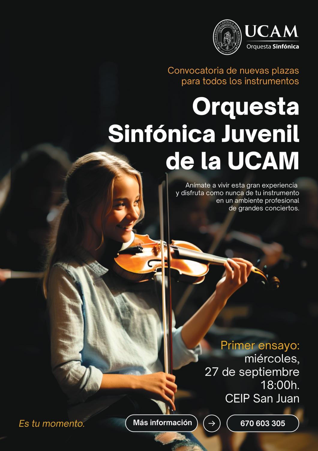 La Universidad Católica de Murcia ha creado su Orquesta Sinfónica Juvenil, en la que los jóvenes de la Región pondrán poner en práctica y mejorar sus conocimientos musicales, participando en grandes conciertos en un ambiente profesional. Esta agrupación, dependiente de la Orquesta Sinfónica de la UCAM, nace con vocación de servicio, gracias a la apuesta de esta Universidad por la difusión y apoyo a la cultura, teniendo como objetivo ofrecer una formación integral a los jóvenes músicos, poniendo a su alcance los medios necesarios para que adquieran una experiencia orquestal de máxima calidad.
