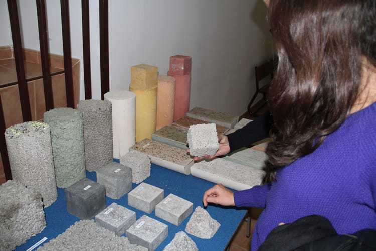 Foto: Alumnos observan unas muestras de hormigón dispuestas en la puerta del salón de actos.