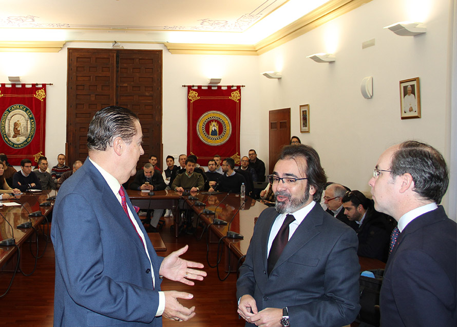 El Campus de los Jerónimos ha acogido esta mañana la charla-coloquio sobre ‘Nuevas infraestructuras para la Región’, a cargo del consejero de Presidencia y Fomento, Pedro Rivera, organizada por el Grado de Ingeniería Civil y que ha reunido a profesores y alumnos de este grado, así como de Arquitectura, Ingeniería de Caminos e Ingeniería de Edificación.