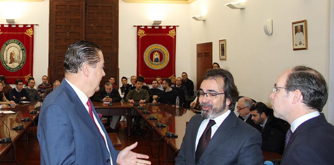El consejero mantiene un encuentro con el claustro de profesores de Ingeniería Civil, Ingeniería de Edificación, Ingeniería de Caminos y Arquitectura de la UCAM para presentarles los principales proyectos que está cerrando el ejecutivo