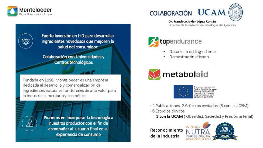 Pedro Emilio Alcaraz, director del Centro de Investigación en Alto Rendimiento Deportivo, habló sobre la investigación con polifenoles. Por otro lado, Pilar Zafrilla, vicedecana del Grado en Farmacia, informó de los efectos beneficiosos del consumo de brotes de brócoli. Silvia Montoro, doctora en Biología, arrojó información en torno a los ensayos clínicos con ratones para valorar la toxicidad. Francisco Javier López, director de la Cátedra de Fisiología del Ejercicio, mantiene una colaboración con Nuria Caturla, product development Manager en Monteloeder, afirmando que: “los clientes están más informados que nunca al realizar búsquedas en internet y, a ello contribuye que los estudios cuenten con un aval científico. Es por eso que el hecho de que un producto cuente con ensayos científicos hace bien a la industria”. Además, destacó lo positivo de su experiencia con la Universidad Católica de Murcia y el grupo de investigación.