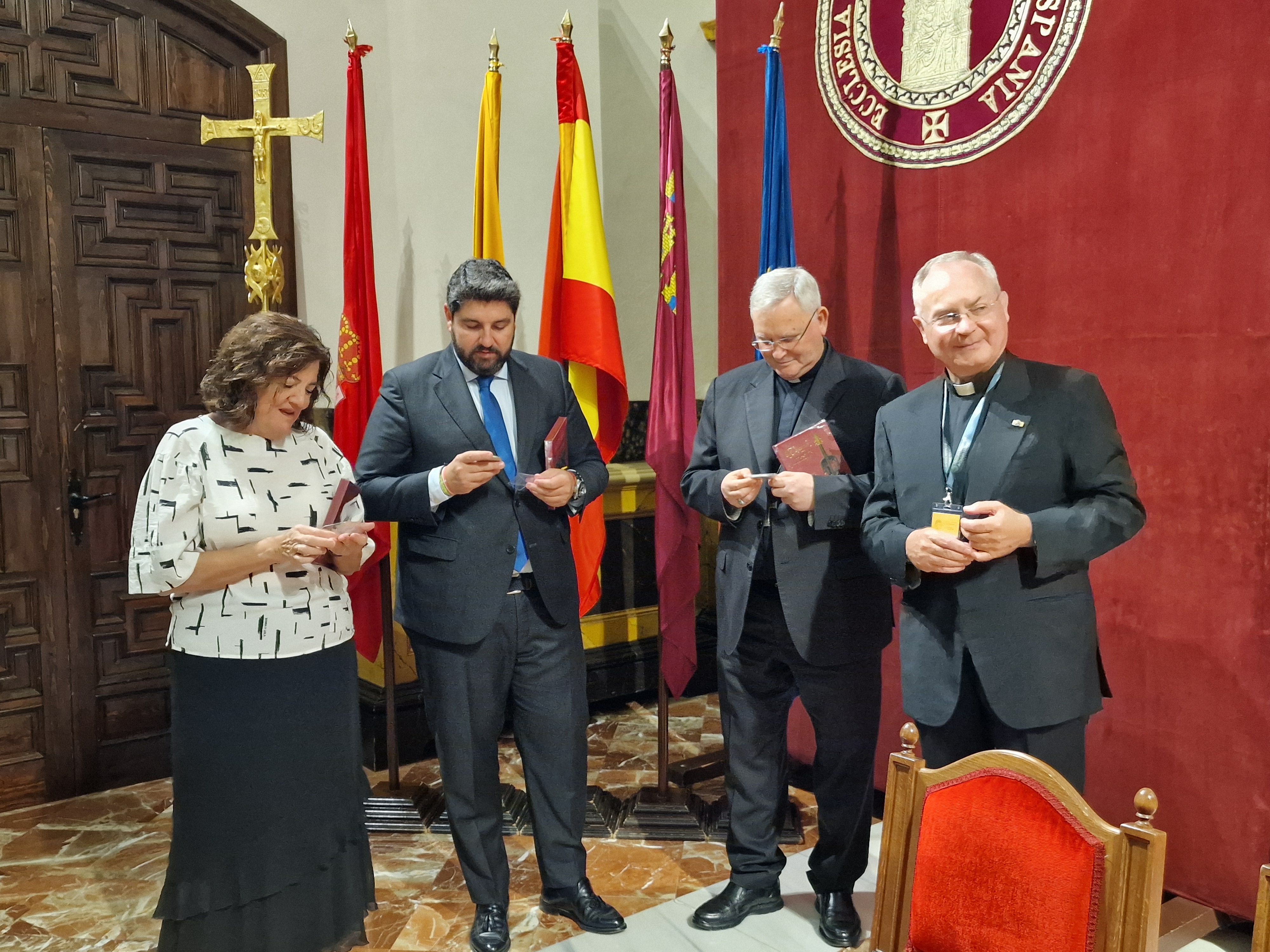 La presidenta de la UCAM, el presidente de la Región de Murcia y el obsipo de Cartagena, obeservan la medalla entregada por Tiziano Ghirelli, canónico del Capítulo de la Basílica Papal de San Pedro (Roma).
