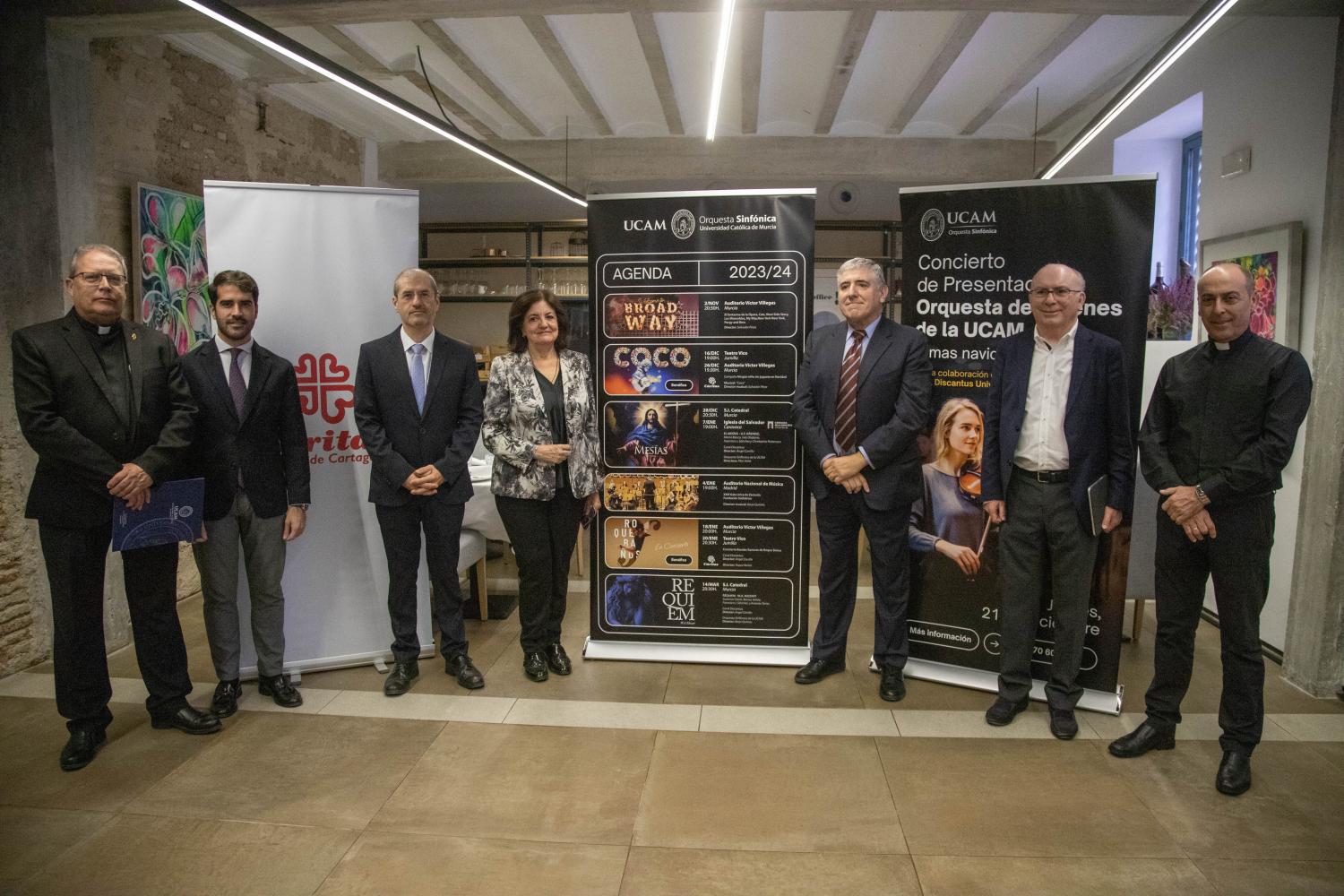 En la presentación de la programación, que ha tenido lugar esta mañana en la Escuela de Hostelería de Caritas en Murcia, ha intervenido María Dolores García, presidenta de la UCAM, quien ha destacado que “para mí es una alegría poder continuar con este proyecto con la misma ilusión que tenía José Luis, mi marido”, resaltando la importancia de los conciertos benéficos, con los que la Orquesta cumple con “su misión social y caritativa de la mano de instituciones como Caritas, que abordan las necesidades de los más pobres”.