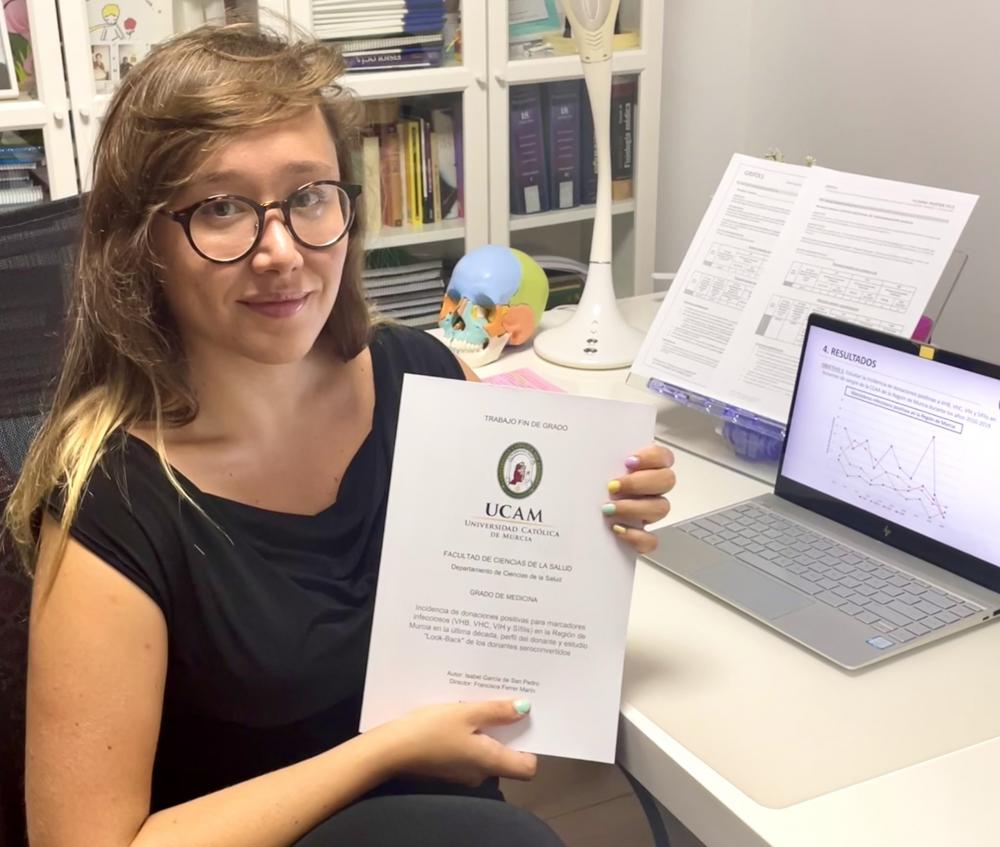 La graduada en Medicina por la UCAM, Isabel García de San Pedro, ha investigado la incidencia de donaciones de sangre positivas para el virus de la Hepatitis B y C, Inmunodeficiencia Humana y Sífilis en la Región de Murcia durante los años 2010-2019. Su estudio, recogido en su Trabajo Fin de Grado bajo la dirección de la hematóloga y profesora del título Francisca Ferrer Marín, ha recibido el ‘Premio al Mejor Poster Defensa’ en el XXXII Congreso de la Sociedad Española de Transfusión Sanguínea y Terapia Celular.